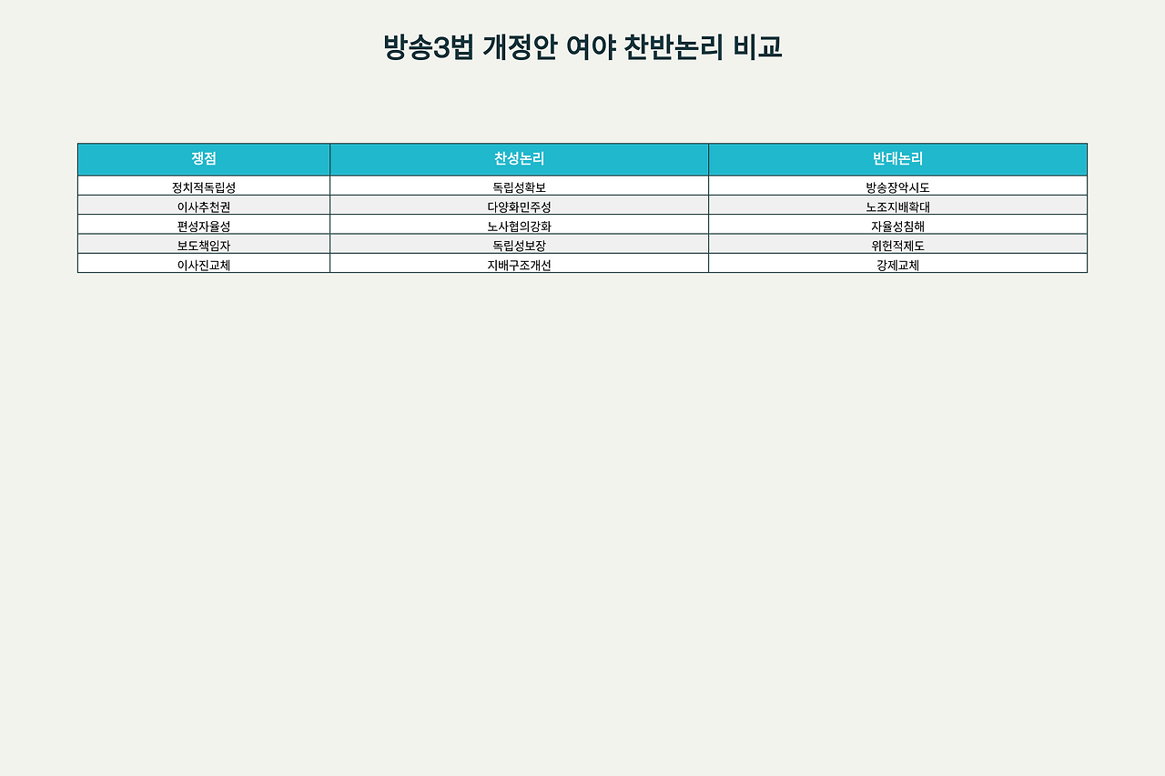 국민의힘은 방송3법을 **"민주당의 방송 장악법"**으로 규정하며 강력히 반대하고 있다:ichannela