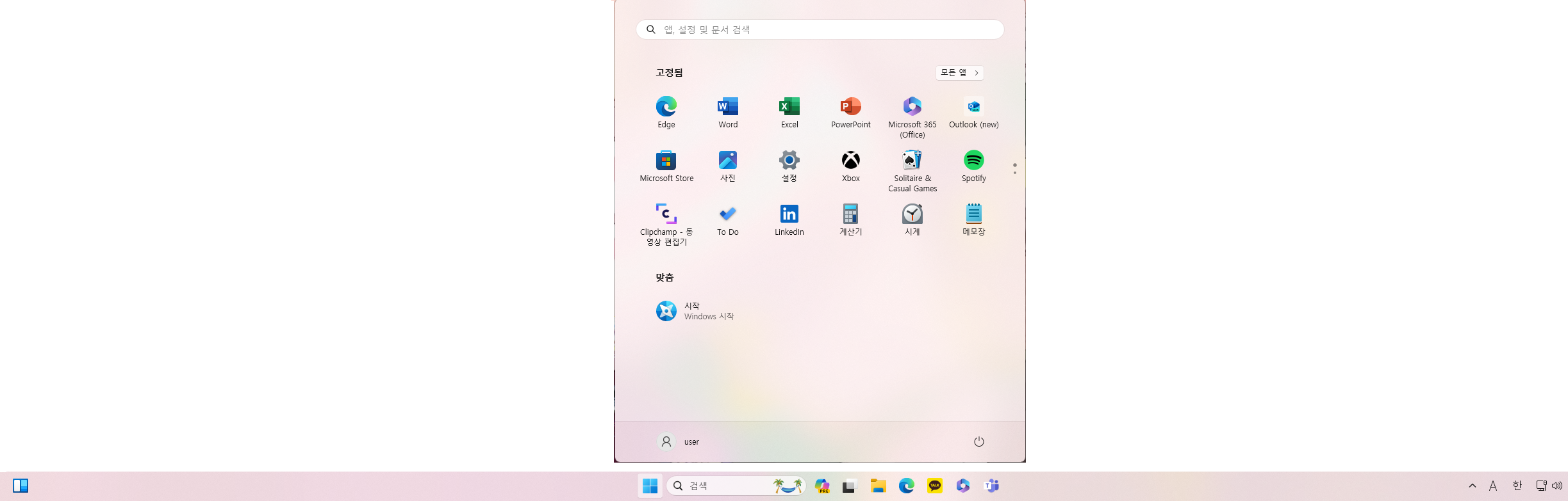 윈도우10에서는 시작메뉴가 왼쪽 하단에 있었는데 윈도우11에서는 Mac OS처럼 가운데로 와있다.
