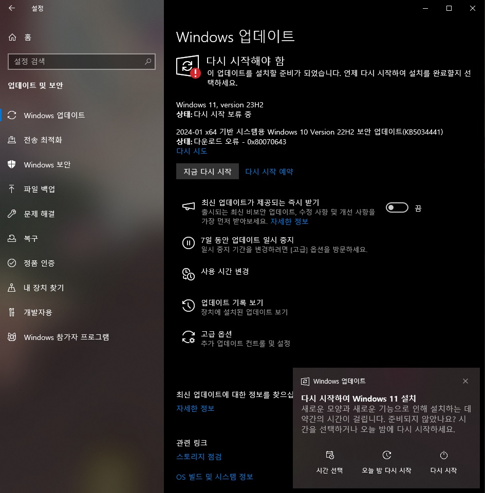 클릭하면 컴퓨터가 재부팅이 되면서 업데이트가 진행이 된다.